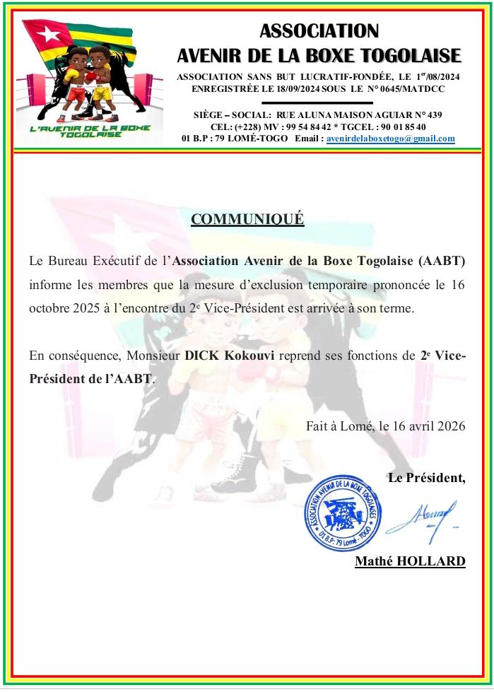 En conséquence, la présente vous notifie la fin de cette mesure d’exclusion temporaire ainsi que votre rétablissement dans vos droits et fonctions de 2ᵉ Vice-Président de l’Association Avenir de la Boxe Togolaise (AABT) », informe la lettre adressée à l’intéressé.