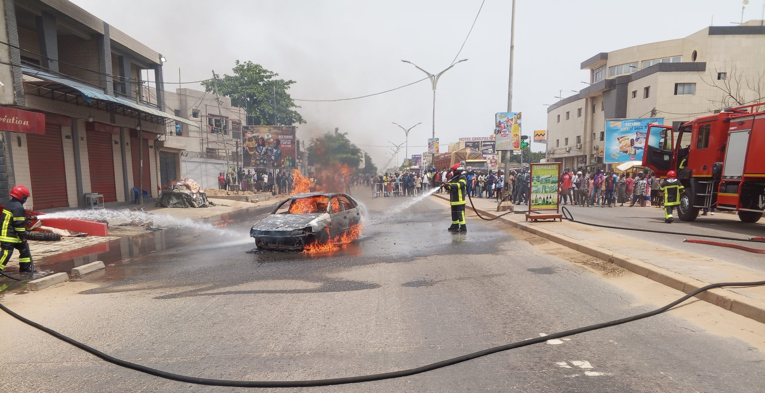 Un véhicule de la contrebande contenant les bidons d’essence appelés communément « Boudè » a fini sa course en feu, en pleine circulation pendant que le chauffeur a été poursuivi par les forces de sécurité. Même si pour l’heure aucun communiqué ne définit les circonstances du drame, il faut rappeler que le chauffeur à bord du véhicule a été poursuivi lors de son transit vers la capitale Lomé par une unité des forces de sécurité qui a rebroussé chemin juste après le déclenchement de l’incendie qui n’a ni fait de victimes ni de dégâts matériels nonobstant le véhicule en question aux yeux des usagers de la route qui n’ont pas manqué de la vigilance devant les faits. Le chauffeur quant à lui a eu la vie sauve en abandonnant son véhicule.